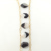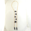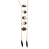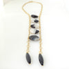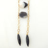 Materials are: gold plated brass circular chain, black dyed agate stones, black onyx pointed ovals, gold crystal beads, with a gold plated brass necklace clasp and extender chain. Length of necklace (to top stone) is 18", agate stones hang 12" from the bottom center of the necklace (including top stone), and the necklace column is 2.25" wide.