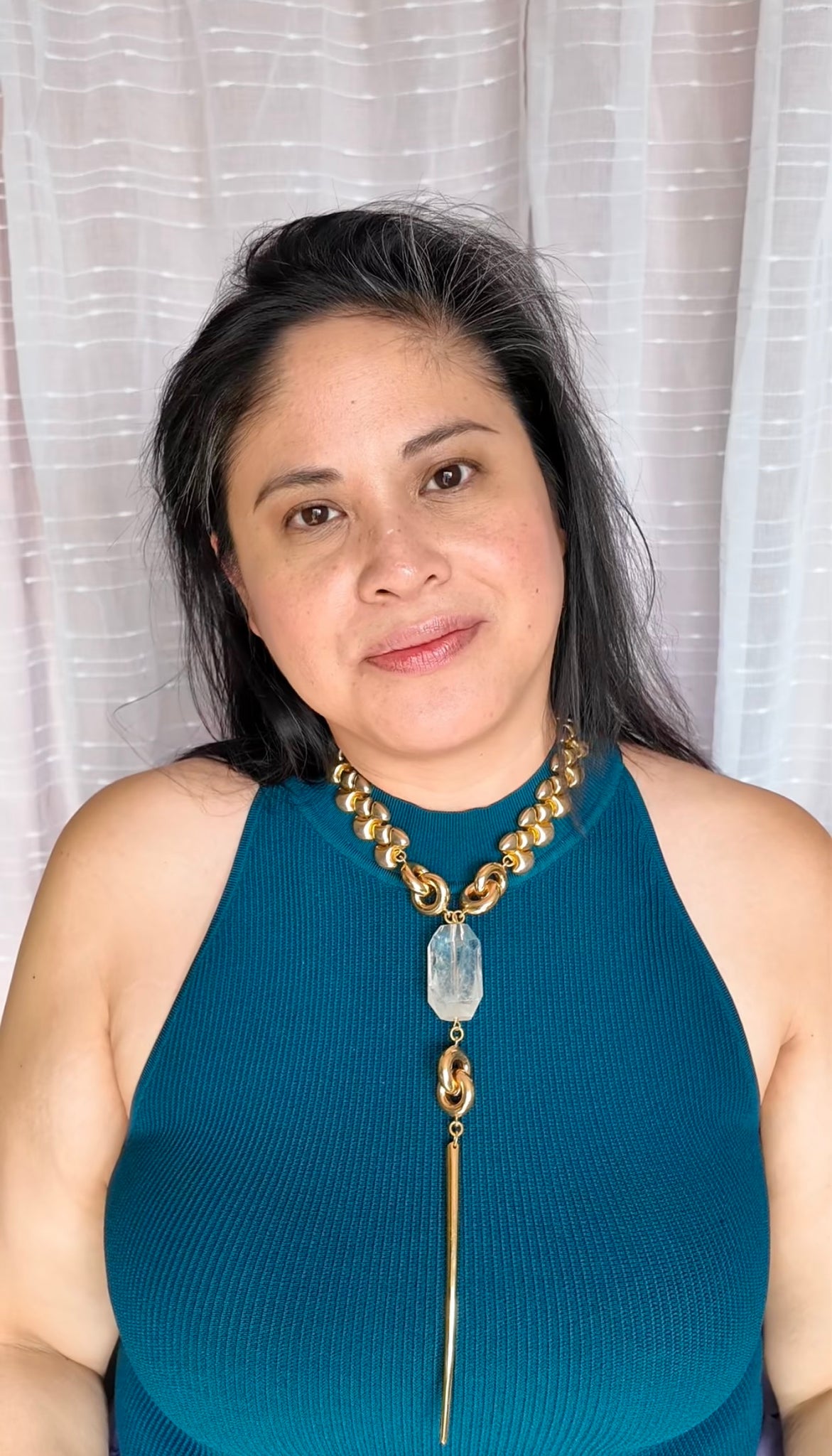 Materials are: a 1980's vintage gold plated metal puffy link necklace, gold plated metal knot components, a large clear quartz nugget, a gold plated brass spike pendant, with a gold plated brass necklace clasp and extender chain. Length of necklace is 18", and puffy links are 1" wide, knot components are 1.25" long and 3/4" wide, quartz nugget and spike hang 9" below the center of the necklace, quartz nugget is 2" long and 1 1/8" wide, and gold spike is 4.75" long and 3/8" at its widest point.