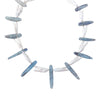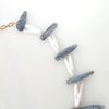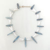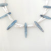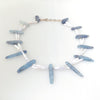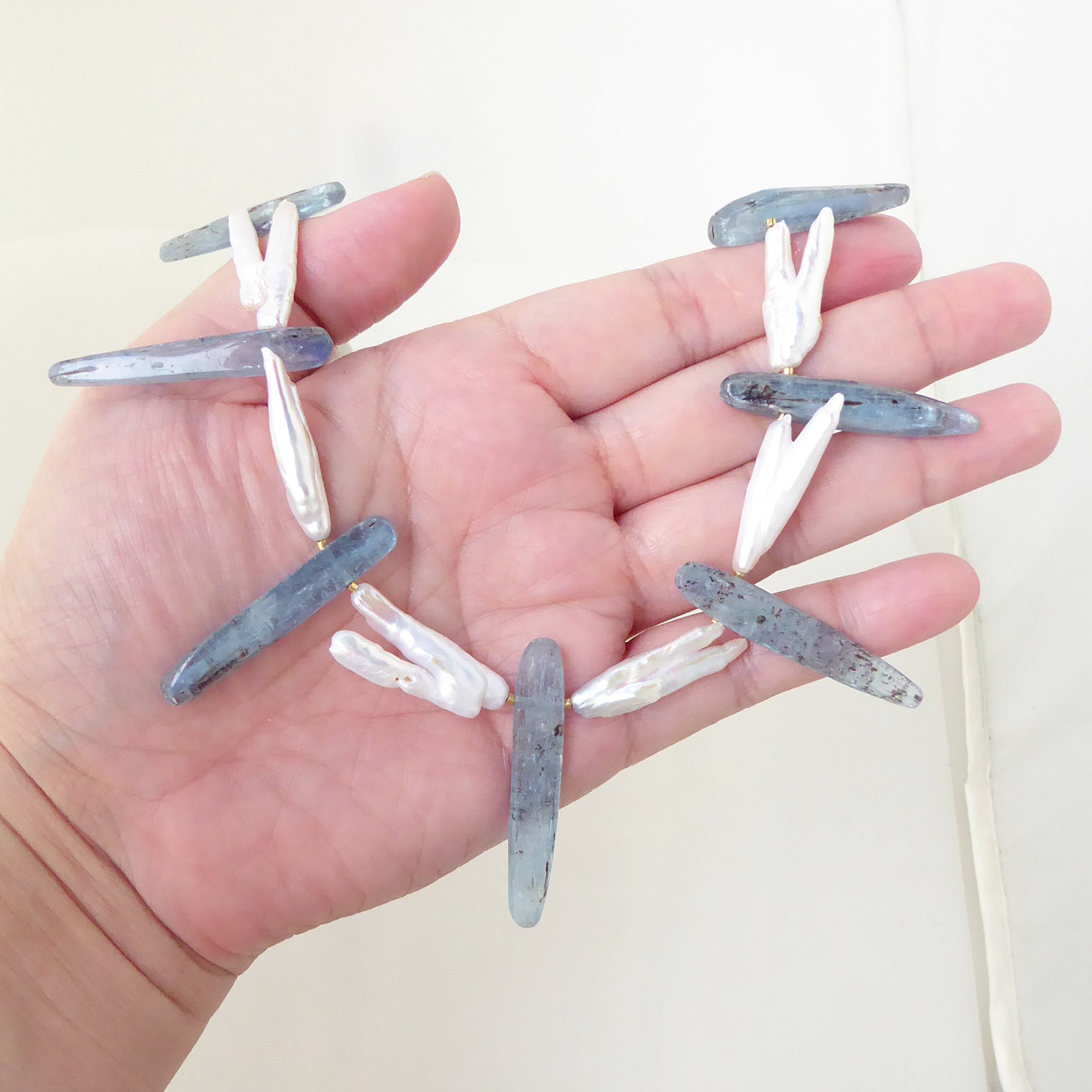 Materials are: kyanite points, "pants shaped" freshwater pearls, glass seed beads, with a gold plated brass necklace clasp and extender chain. Length of necklace is 20", and it is 1 7/8" at its widest point (kyanite piece at the bottom center). Due to the nature of the kyanite, there is irregularities in shape and color, and the pearls differentiate in shape. It is slightly on the heavier side, so it is not for those who are unaccustomed to wearing slightly heavier pieces.
