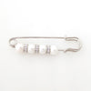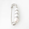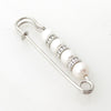 Materials are: silver plated brass safety pin, freshwater pearls, silver plated brass and clear rhinestone spacers. Length of brooch is 3" and 3/4" at its widest point. Due to the nature of this brooch, the components are loosely stacked on the pin. The space between the top pearl and the pin clasp is the amount of space you can affix it to your clothing. This brooch is best worn on slightly thicker to heavier fabrics due to its weight.