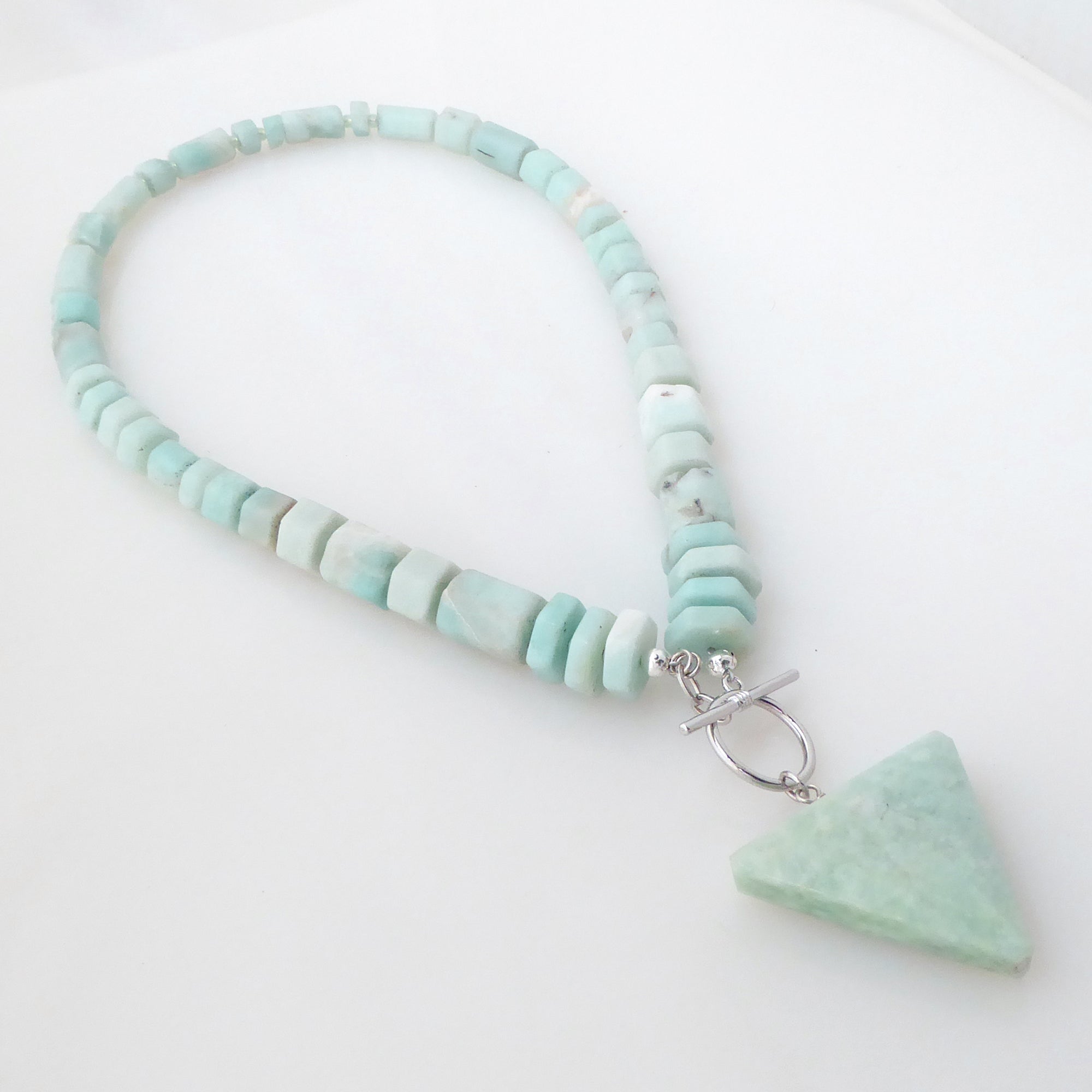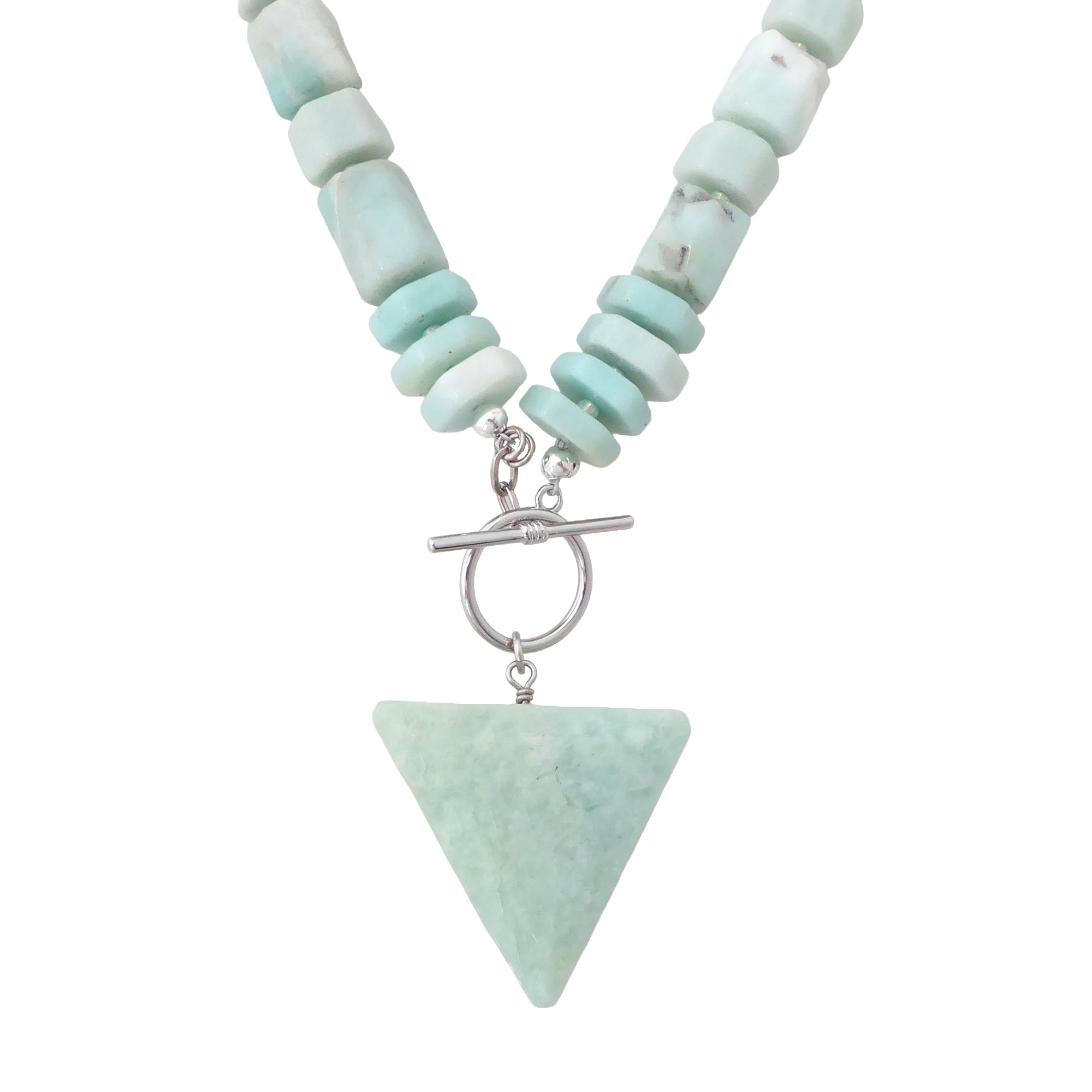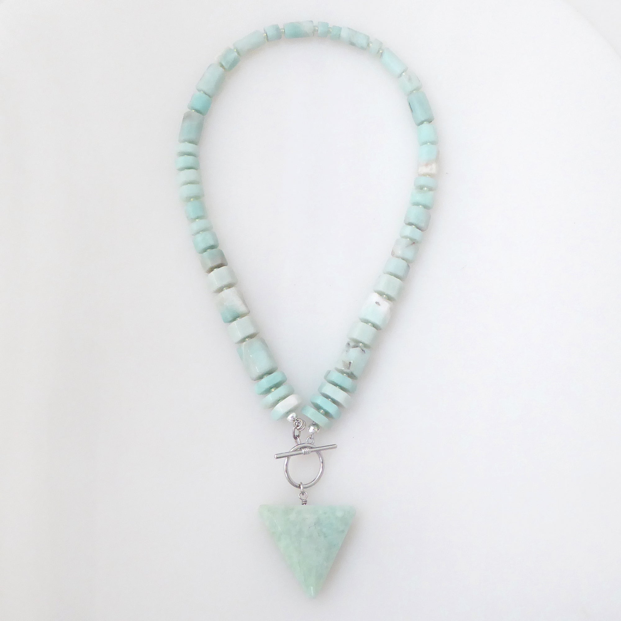 Materials are: amazonite stone beads, pale green seed beads, a large amazonite triangle pendant, with a silver plated brass toggle clasp. Length of necklace is 19", toggle and amazonite triangle hang 2.5" from the bottom center, and triangle is 1 5/8" wide and 1.5" high. It is slightly on the heavier side, so it is not for those who are unaccustomed to wearing slightly heavier pieces.
