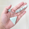 Make a bold statement with this striking amazonite triangle necklace. Chunky amazonite beads in delightful pastel green hues create a calming, natural aesthetic, while the large triangular pendant serves as an eye-catching focal point! Amazonite is a calming, blue-green crystal used to soothe emotional trauma, alleviate worry, and promote open communication. It facilitates self-discovery and balances masculine/feminine energies.