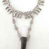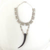 Materials are: a vintage 1950's silver plated metal collar necklace, vintage 1970's silver plated metal link components , antelope horn, clear quartz, with a silver plated brass necklace clasp and extender chain.  Length of necklace is 17", collar width is 7/8", and silver links and pendant hang 6.5" from the bottom center part of the necklace.  It is slightly on the heavier side, so it is not for those who are unaccustomed to wearing slightly heavier pieces.