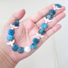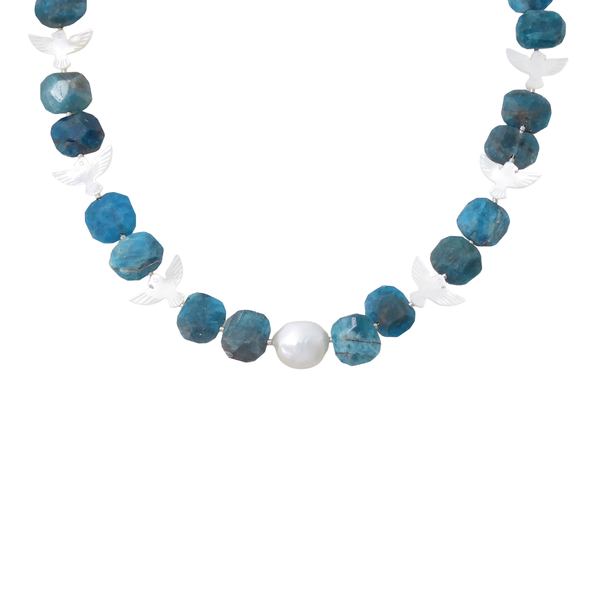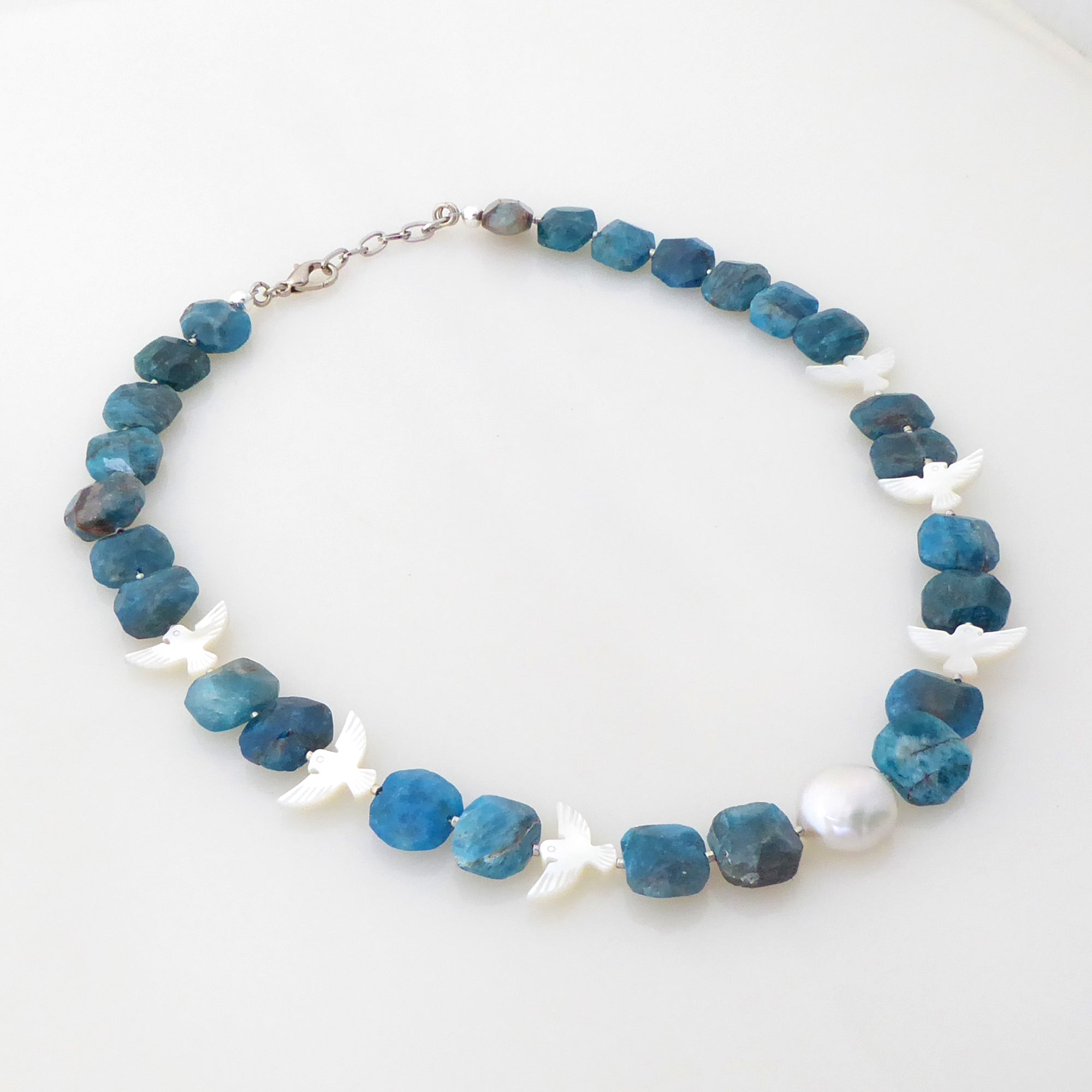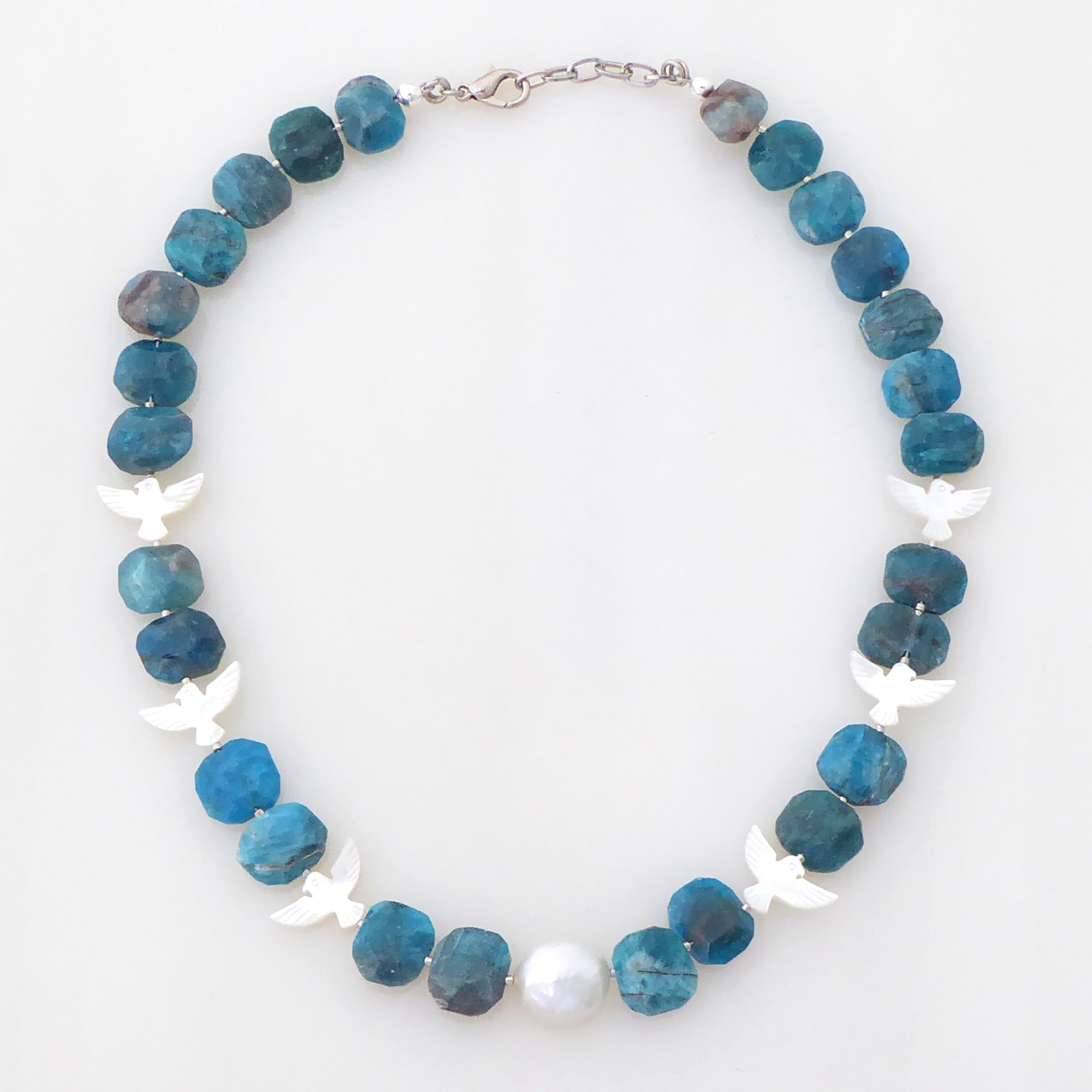 Illuminate your style with this enchanting necklace featuring vibrant blue apatite stones paired with luminescent mother of pearl birds. The striking contrast between the deep, radiant blue gemstones and the iridescent bird charms creates a captivating, colorful piece that catches the light beautifully.  Blue apatite is a naturally occurring stone frequently used to enhance communication, clarity, and personal motivation.