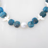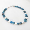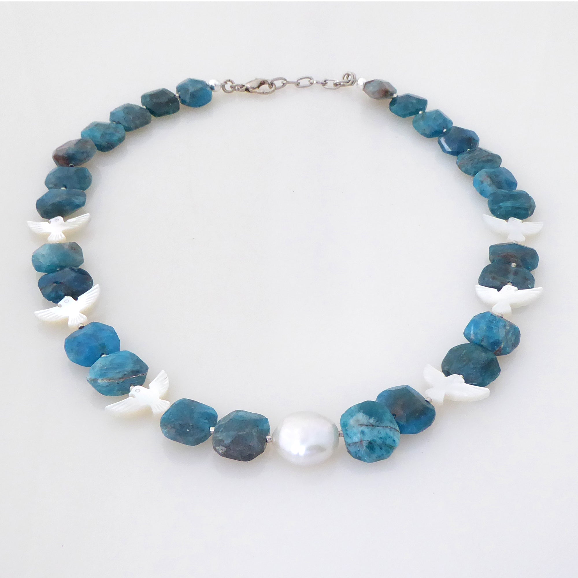 Materials are: blue apatite stone beads, mother of pearl bird beads, a freshwater pearl, with a silver plated brass necklace clasp and extender chain.  Length of necklace is 19.5", apatite stones are approximately 5/8" wide, birds are 3/4" wide, and pearl is 5/8" high and 11/16" wide.  It is slightly on the heavier side, so it is not for those who are unaccustomed to wearing slightly heavier pieces.