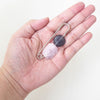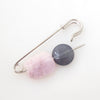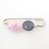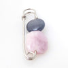 Materials are: pink kunzite crystal, dyed gray quartz, and a silver plated brass safety pin. Brooch is 3" long and 1" at its widest point. Due to the nature of the dyed quartz, please keep it out of direct sunlight, or the color will fade.