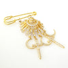 Materials are: a gold plated metal safety pin, a vintage 1980's gold plated metal and rhinestone circular cone component, and gold plated brass and rhinestone moon and dagger charms. Length of brooch is 4.5" and is 2.75" at its widest point. Due to the nature of the vintage rhinestone cone, it has some visible chipping on the gold plating on the top, and on the back of the piece. All the rhinestones are intact. It is slightly on the heavier side, so it is not for those who are unaccustomed to wearing slightly heavier pieces.